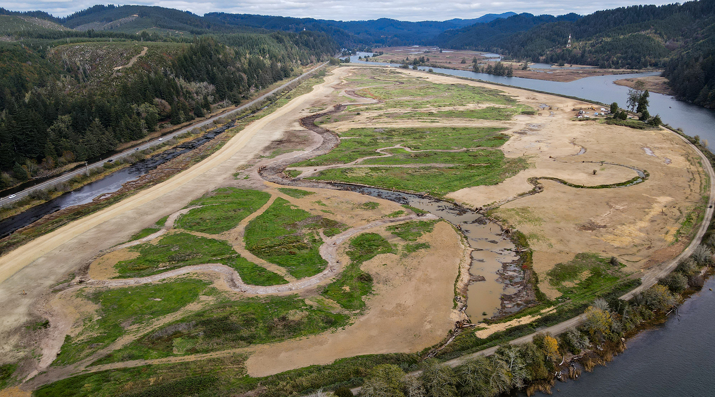 The haich ikt’at’uu Tidal Wetland Restoration Project, which completed its third year of construction, is currently restoring 217 acres of a former dairy farm in Florence, Oregon. Images by ESA and courtesy McKenzie River Trust.