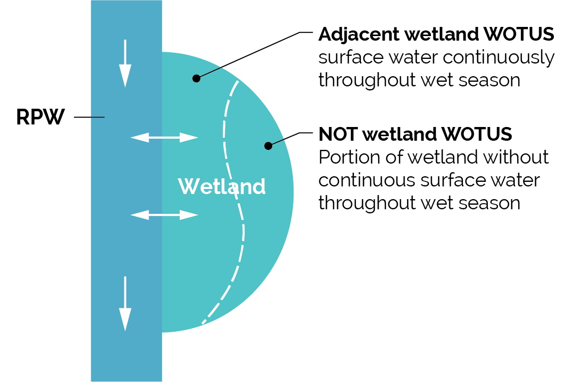 - Adjacent wetlands must be indistinguishable from jurisdictional waters through a continuous surface connection, which means that they must abut a jurisdictional WOTUS and contain surface water throughout the entire wet season (except in times of extreme drought).