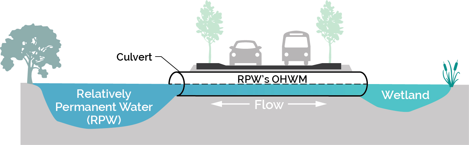 Culverts would not sever jurisdiction when the culvert serves to extend an RPW such that the water directly abuts a wetland, consistent with the March 2025 Continuous Surface Connection Guidance. This would be demonstrated by relatively permanent water flow being present through the culvert as well as an ordinary high-water mark within the culvert.