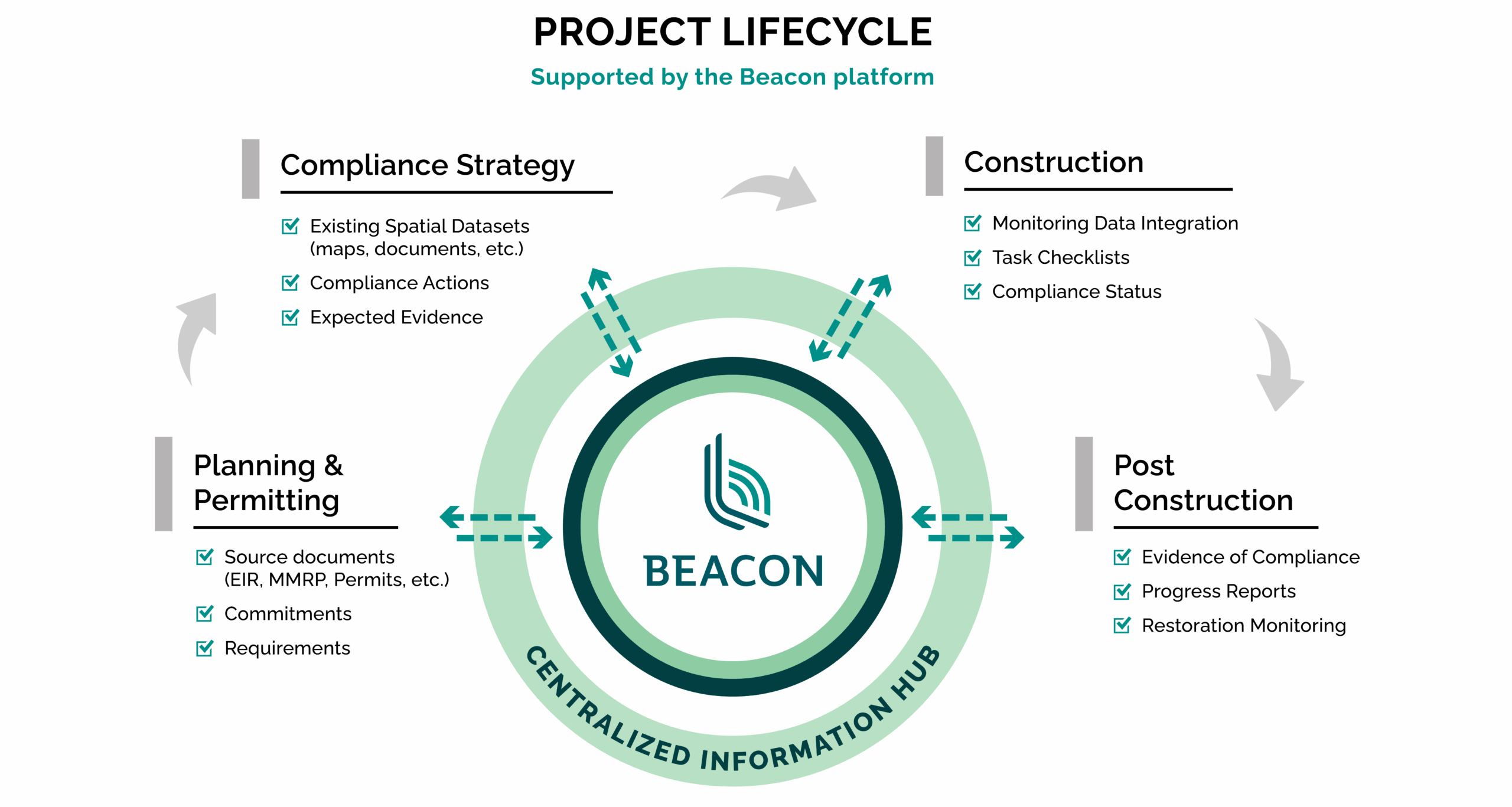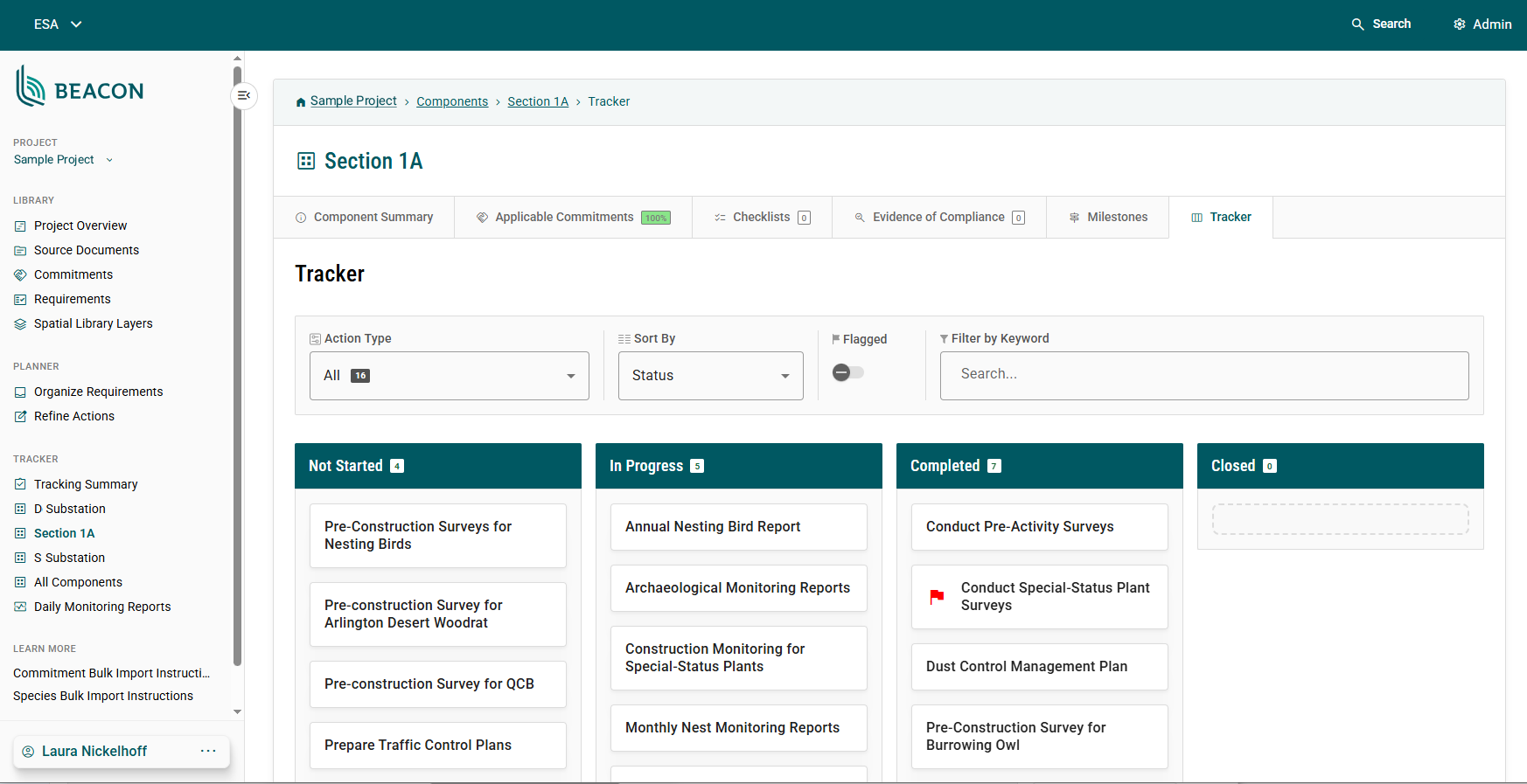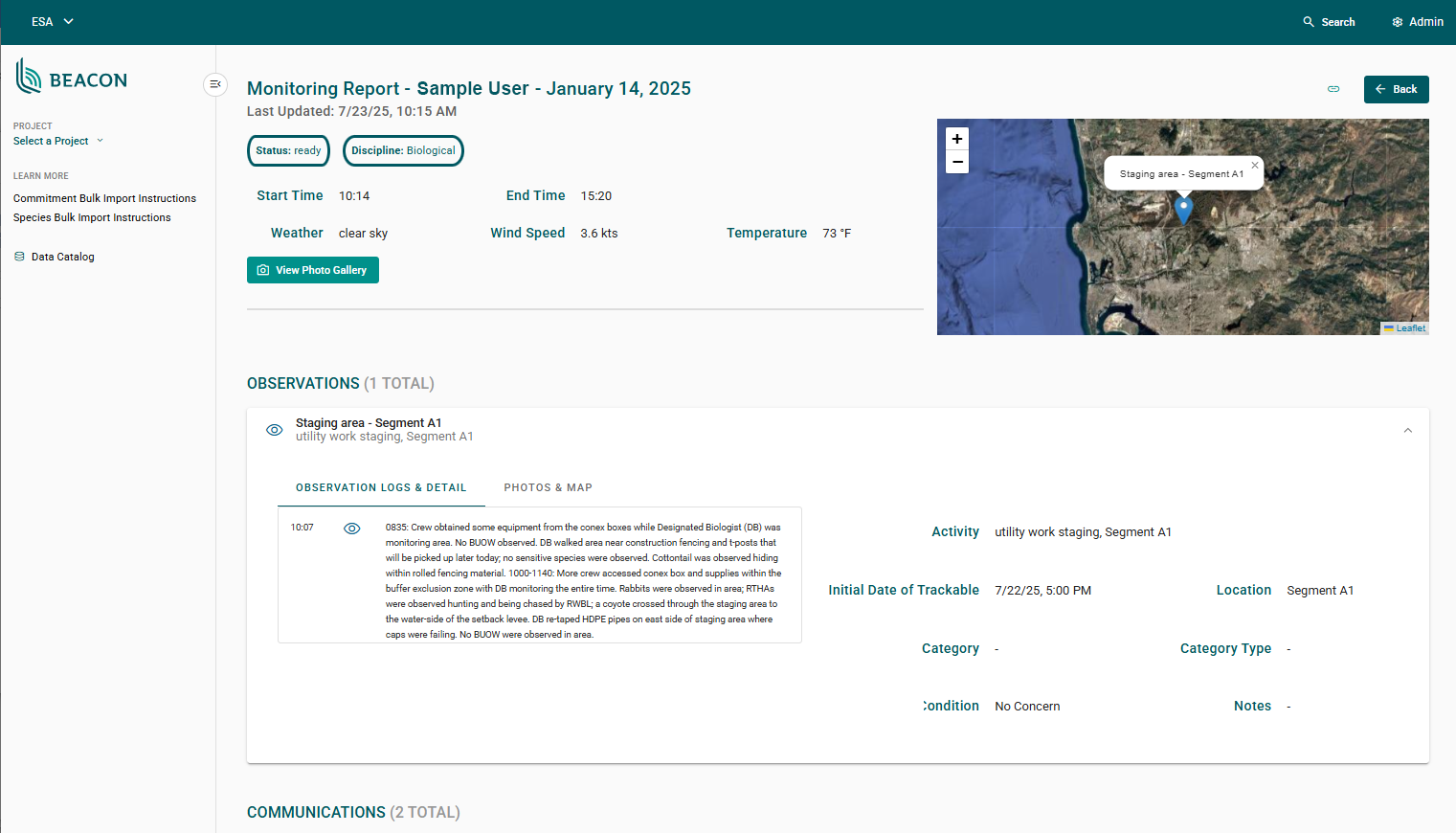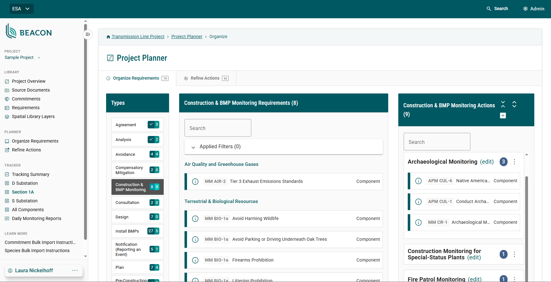 ESA brings deep experience with all aspects of the compliance lifecycle, from analyzing project impacts and designing mitigation measures to data management concerns including monitoring, QA/QC, and reporting. We have leveraged this experience to develop Beacon, an open-source compliance tracking platform. Beacon streamlines the planning and tracking of compliance requirements across the lifespan of a project, equipping managers with a set of comprehensive data management tools specifically designed for the compliance workload. Beacon serves as a common solution that can support a wide range of types and sizes of projects. Our clients use Beacon to simplify tracking, centralize data management, and automate key workflows.